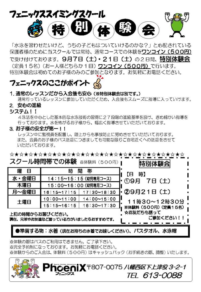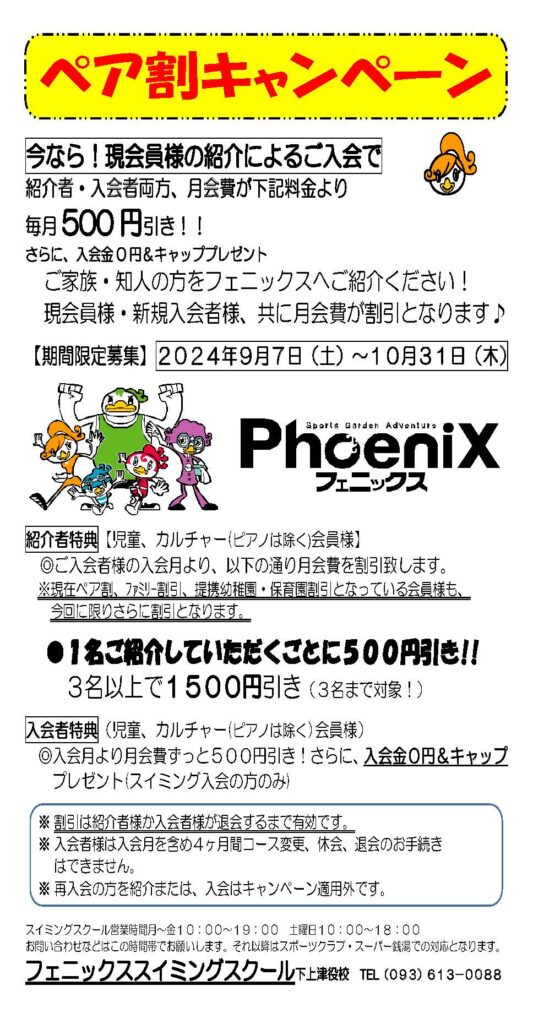 下上津役校:児童スイミングペア割キャンペーンのお知らせ 2024年8月20日 お知らせ 下上津役校 いつも当スポーツクラブをご贔屓いただき誠にありがとうございます。9月7日よりペア割キャンペーンが始まります!合わせて特別体験会も実施いたしますのでぜひご参加ください! 詳細につきましては、下記画像またはPDFファイルよりご確認ください。 児童スイミングペア割キャンペーン【PDFファイル】 URL Copied!