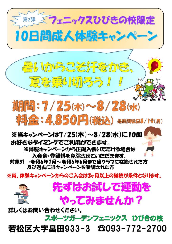 ひびきの校:成人体験キャンペーン第二弾のお知らせ📢 2024年7月25日2024年7月27日 お知らせ ひびきの校 いつも当スポーツクラブをご贔屓いただき誠にありがとうございます。大人の体験キャンペーン第二弾のお知らせを致します!是非この機会にフェニックスへお越しください!⭐️ 詳細につきましては、下記画像またはPDFファイルよりご確認ください。 成人体験キャンペーンのお知らせ【PDFファイル】 URL Copied!
