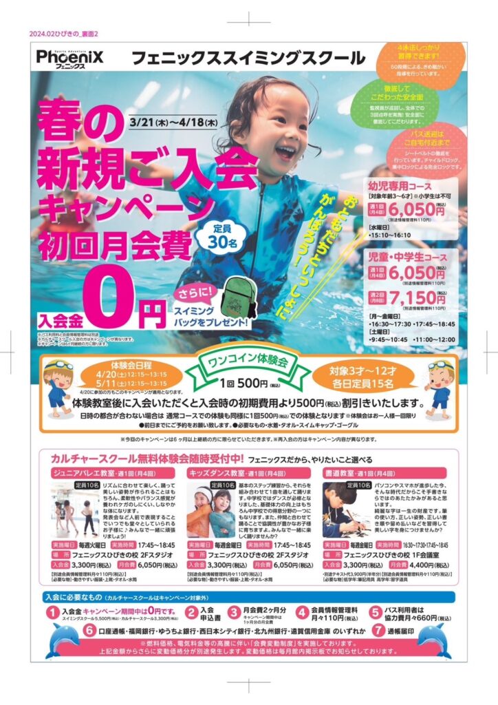 ひびきの校:春の新規入会キャンペーン・児童体験会のご案内 2024年3月22日 お知らせ ひびきの校 いつも当スポーツクラブをご贔屓いただき誠にありがとうございます。春の新規入会キャンペーンを実施中です!ぜひこの機会に春から運動を始めてみませんか☆お気軽に見学お待ちしております♪ ※児童スイミングはワンコイン体験会を開催致します!詳しくはお電話にてご確認下さい。 詳細につきましては、下記画像よりご確認ください。 URL Copied!