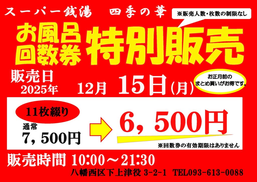 12月15日(月)限定でお風呂入浴回数券特別販売を行います!