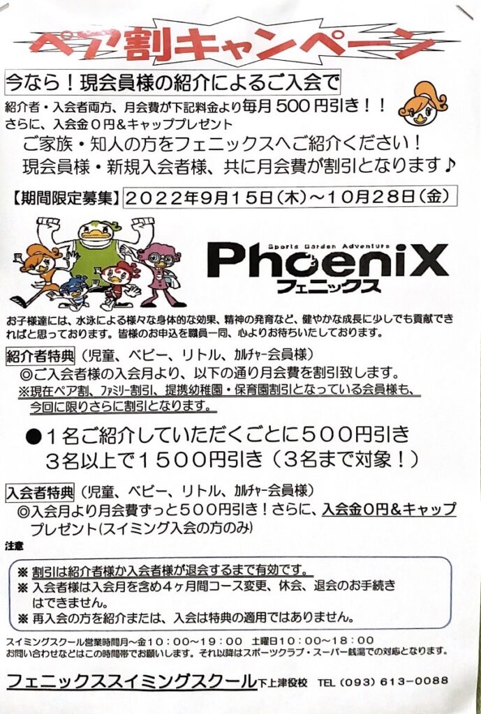 下上津役校:児童ペア割キャンペーンのお知らせ! 2022年9月14日2022年9月15日 お知らせ 下上津役校 いつも当スポーツクラブをご贔屓いただき誠にありがとうございます。児童ペア割キャンペーンにつきましてお知らせ致します。 下記画像よりご確認ください。 URL Copied!