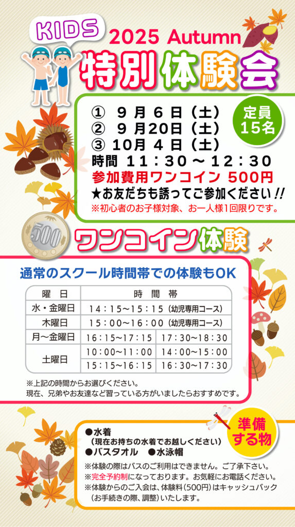 下上津役校:スイミング特別体験会のお知らせ📢 2025年8月21日 お知らせ 下上津役校 いつも当スポーツクラブをご贔屓いただき誠にありがとうございます。下上津役校スイミングスクールにて、9月6日(土)11:30~9月20日(土)11:30〜10月4日(土)11:30〜 特別体験会を開催致します!対象:3歳以上各定員:15名この機会に是非スイミングを体験してみて下さい🌟※予約はお電話にてお問い合わせ下さい♪ 詳細につきましては、下記画像よりご確認ください。 URL Copied!