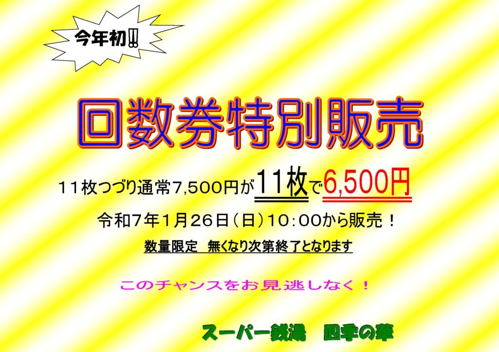 1月26日(日)限定でお風呂回数券特別販売を行います!