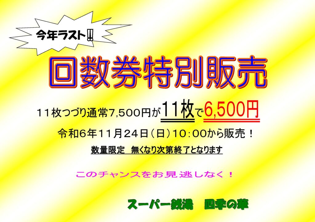 小倉南校:お得な回数券特別販売のお知らせ📢 2024年11月12日 お知らせ 小倉南校 11月24日(日)限定でお風呂回数券特別販売を行います!11枚綴りの回数券が通常価格よりも更にお安くお得になってます!是非お買い求めください♪ 詳細につきましては、下記画像またはPDFファイルよりご確認ください。 お得なお風呂の回数券特別割引販売♪【PDFファイル】 URL Copied!