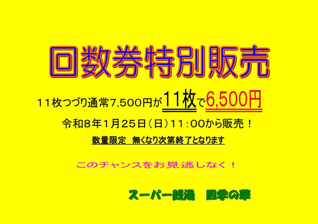 1月25日(日)限定でお風呂回数券特別販売を行います!