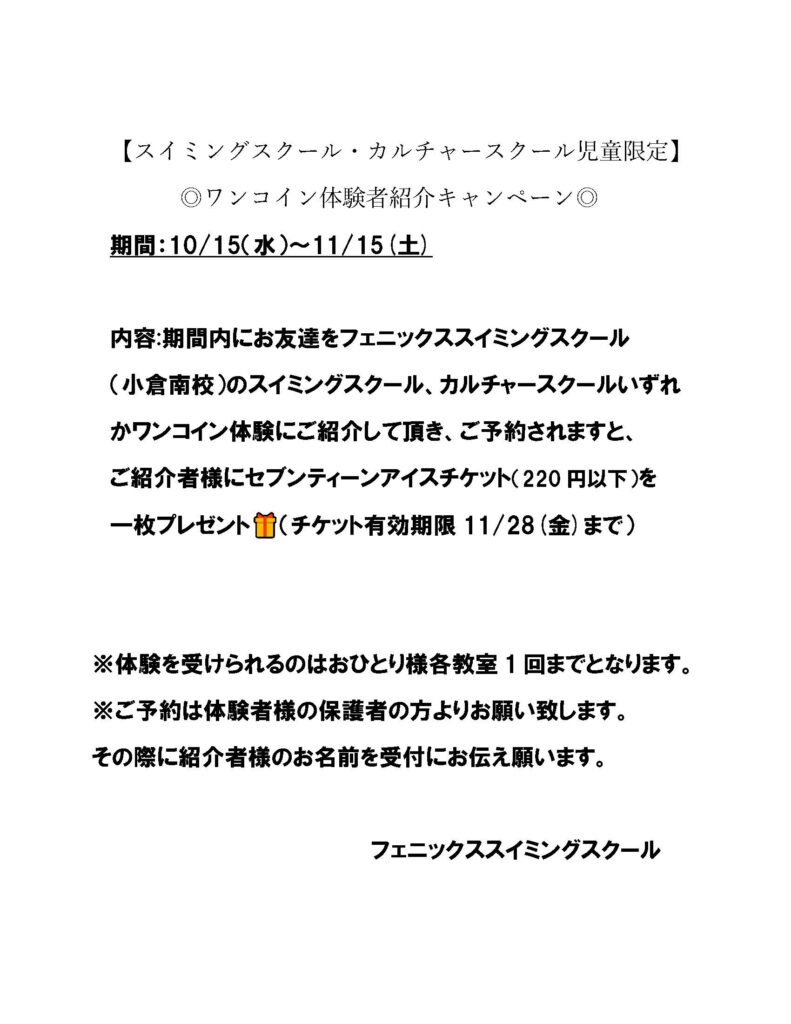 キャンペーン期間内にお友達をスイミングスクール・カルチャースクールいずれかワンコイン体験にご紹介して頂き、ご予約されますと、ご紹介者様にセブンティーンアイスチケット【220以下】1枚プレゼント🎁