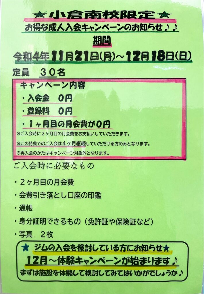 小倉南校:今年ラストのお得な成人入会キャンペーンのお知らせ♪ 2022年11月14日 お知らせ 小倉南校 いつも当スポーツクラブをご贔屓いただき誠にありがとうございます。今年ラストのお得な成人入会キャンペーンのお知らせを致します! 詳細につきましては、下記画像またはPDFファイルよりご確認ください。 成人入会キャンペーンのお知らせ【PDFファイル】 URL Copied!