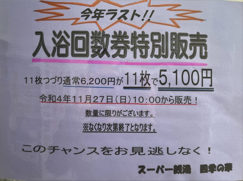 11月27日(日)に今年ラストのお風呂の回数券割引販売を行います!